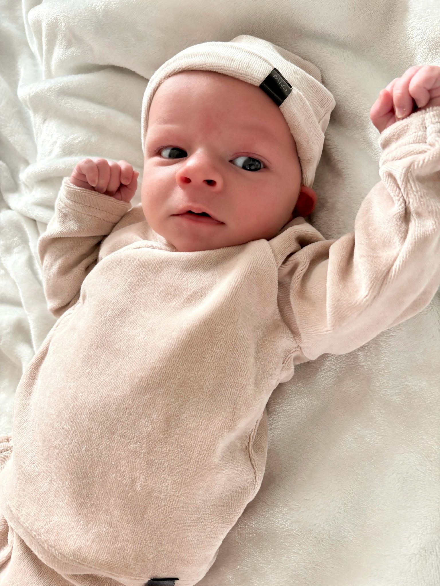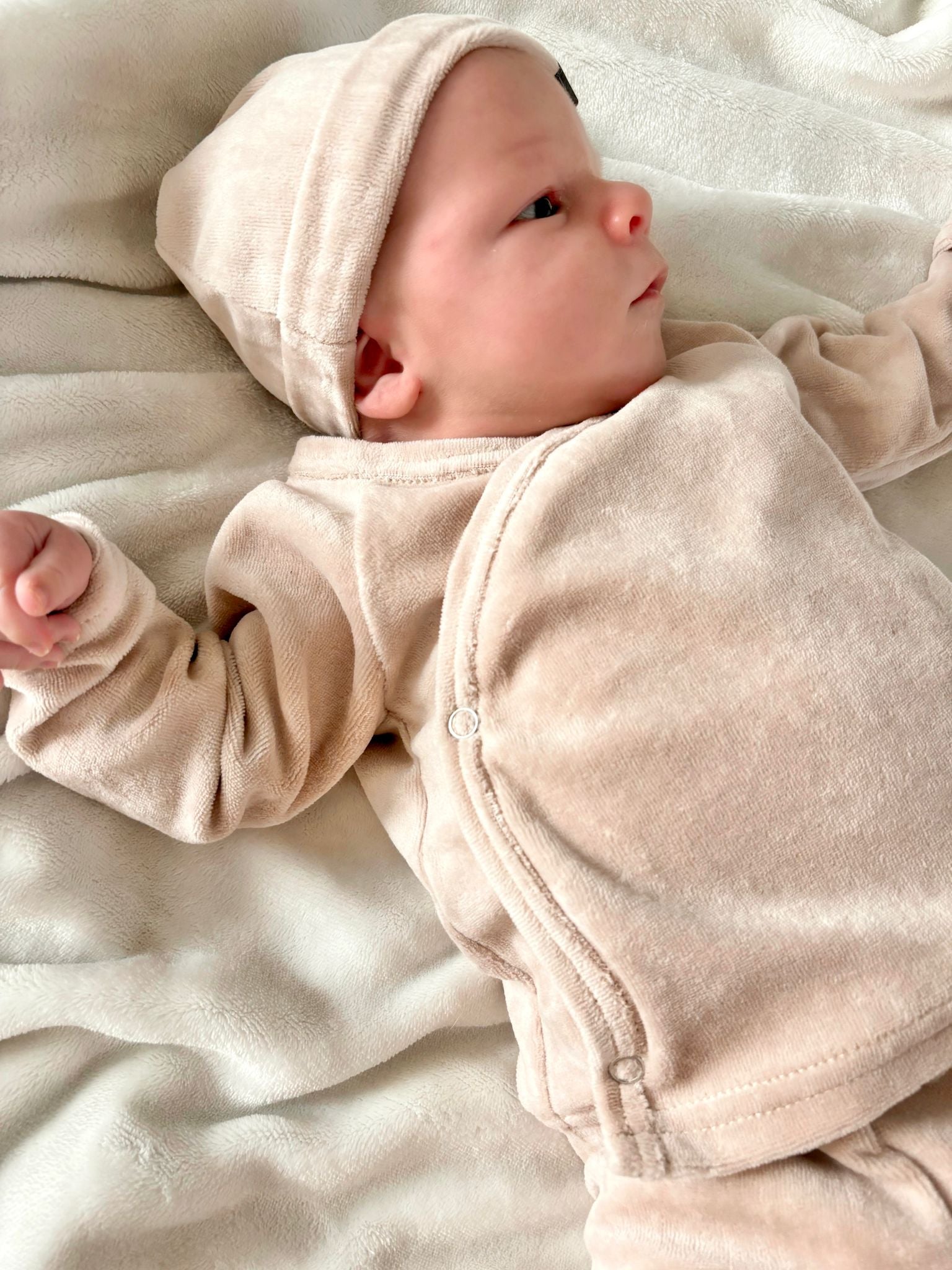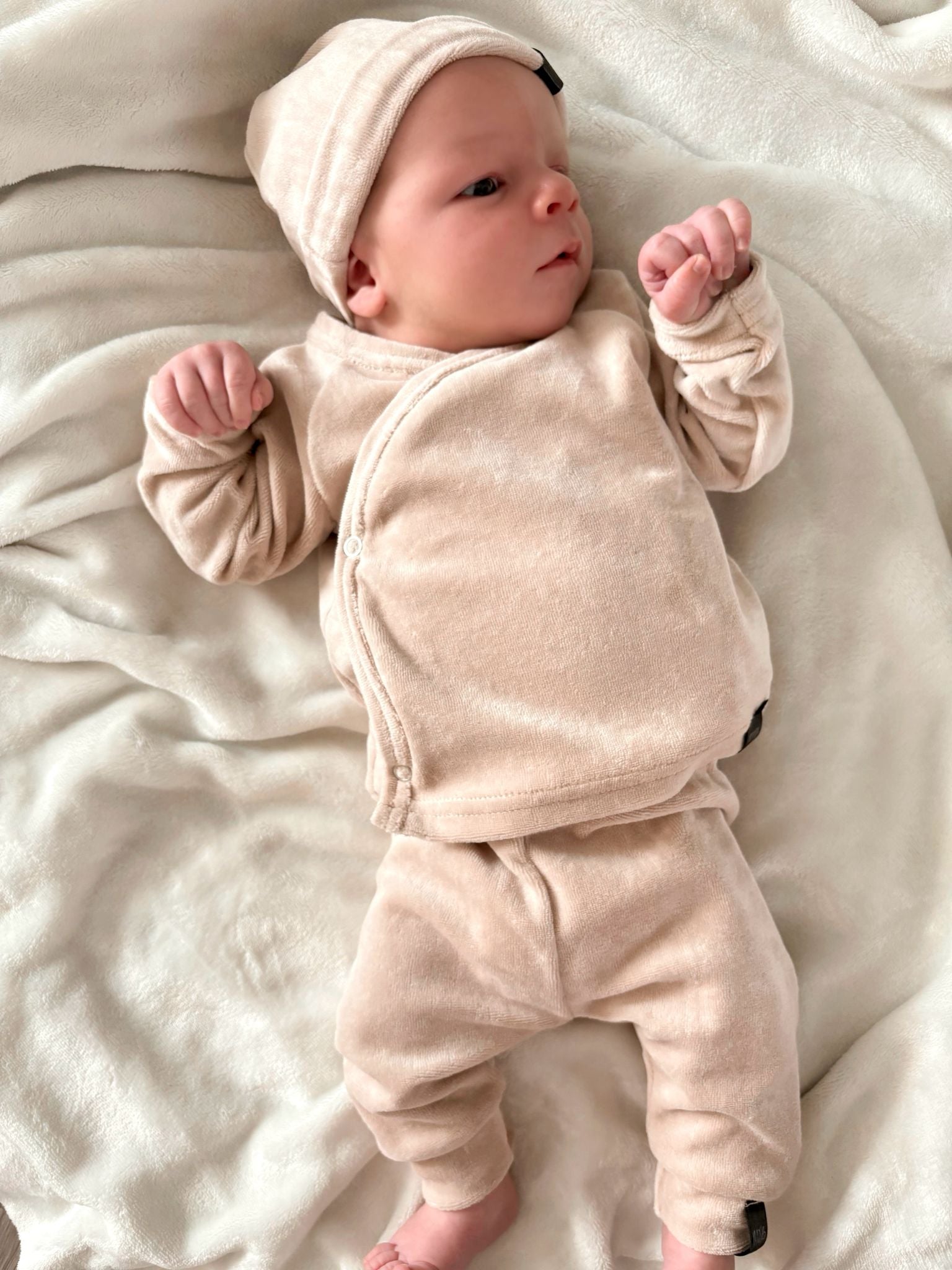 Babykleding - Geboorte/boxpakje unisex zand velour