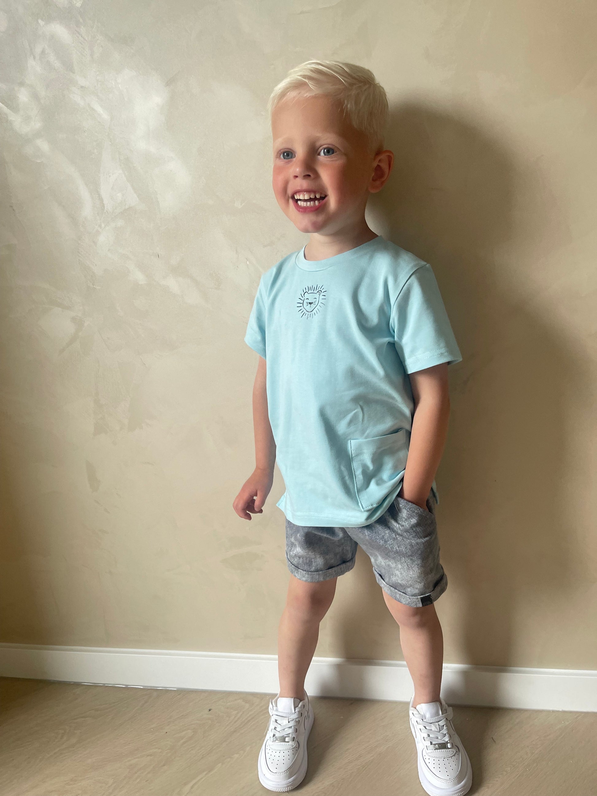 Het heldere blauw is makkelijk te combineren met verschillende kleuren en stijlen. Of je nu kiest voor een jeansshort of een luchtige broek, dit T-shirt past overal bij.