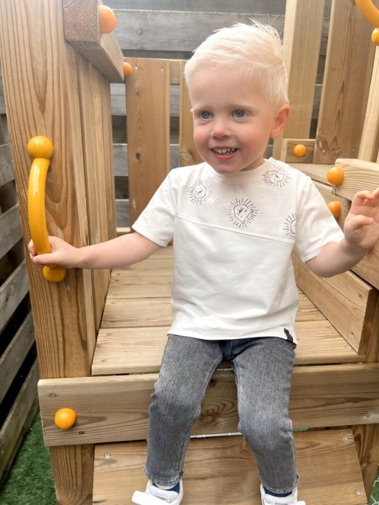 Zachte en Ademend Stof: Het T-Shirt Wit met Logo is gemaakt van hoogwaardige, ademende stoffen die zacht aanvoelen op de gevoelige huid van je kleintje. De stof zorgt ervoor dat je kleintje zich de hele dag comfortabel voelt, of het nu binnen speelt of buiten speelt.
