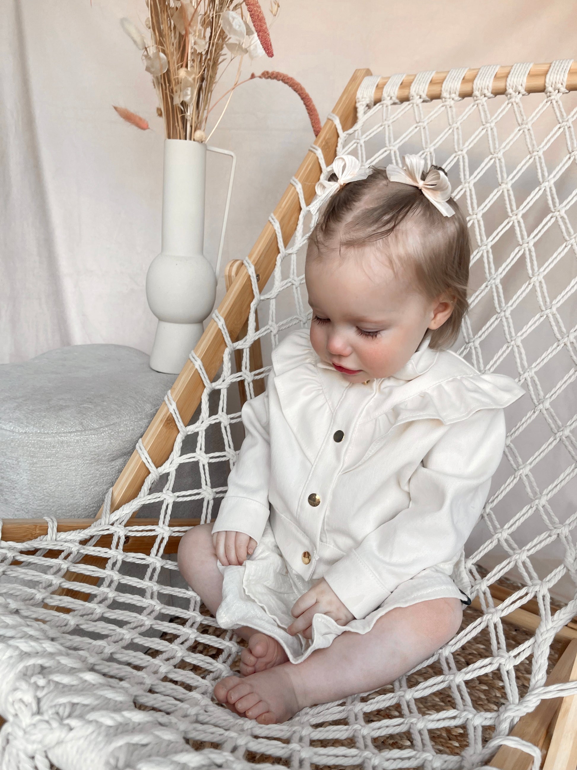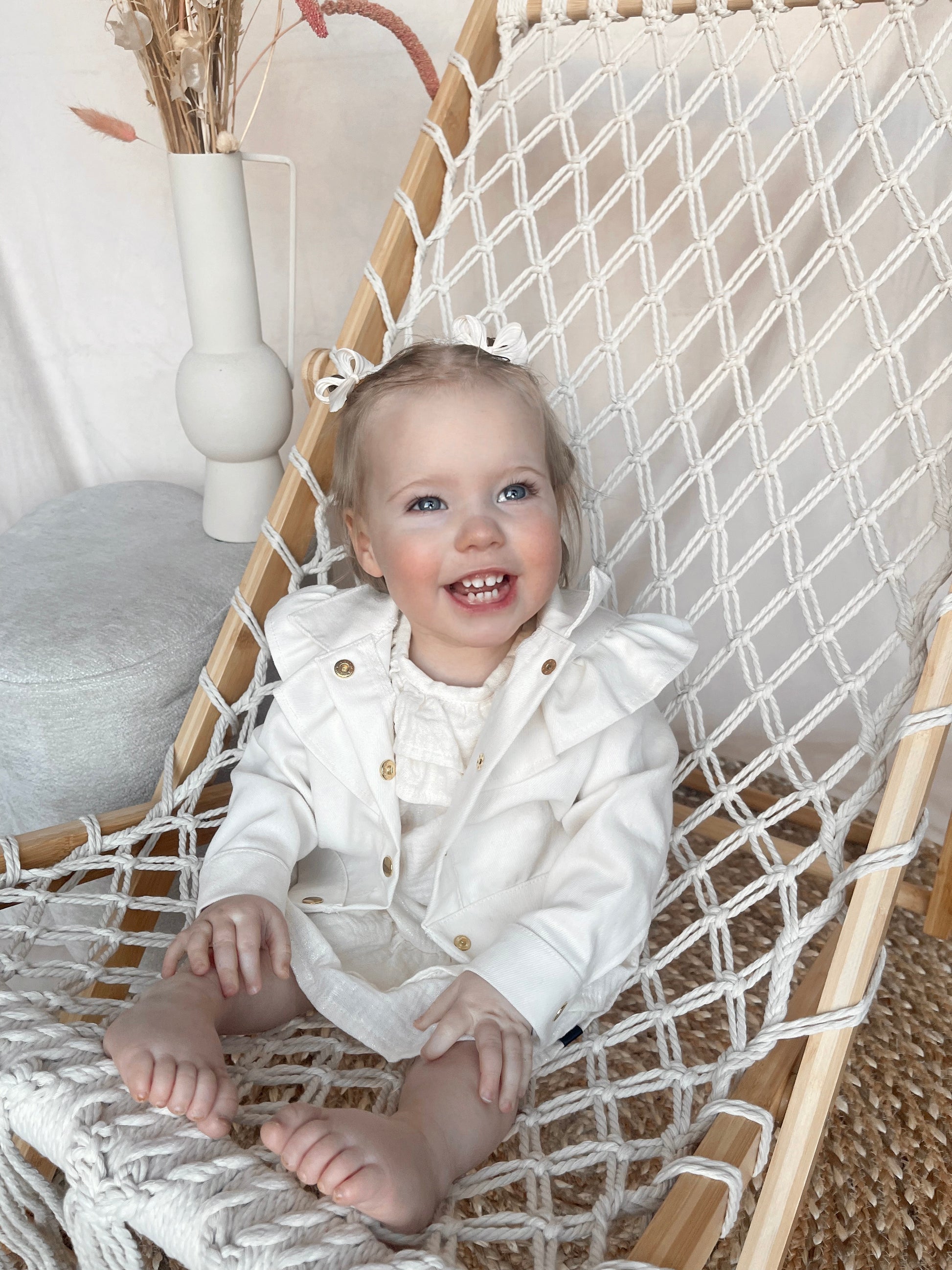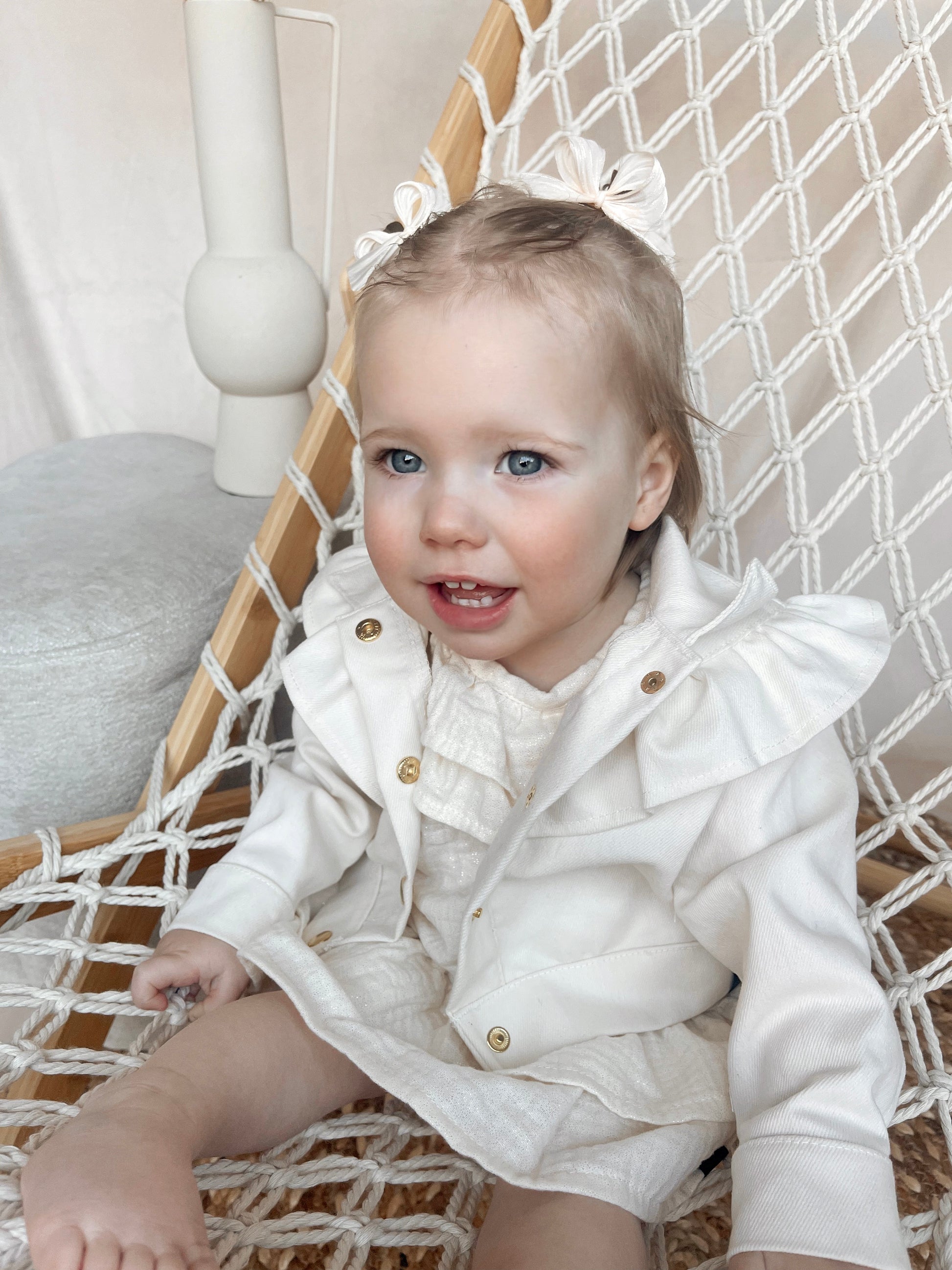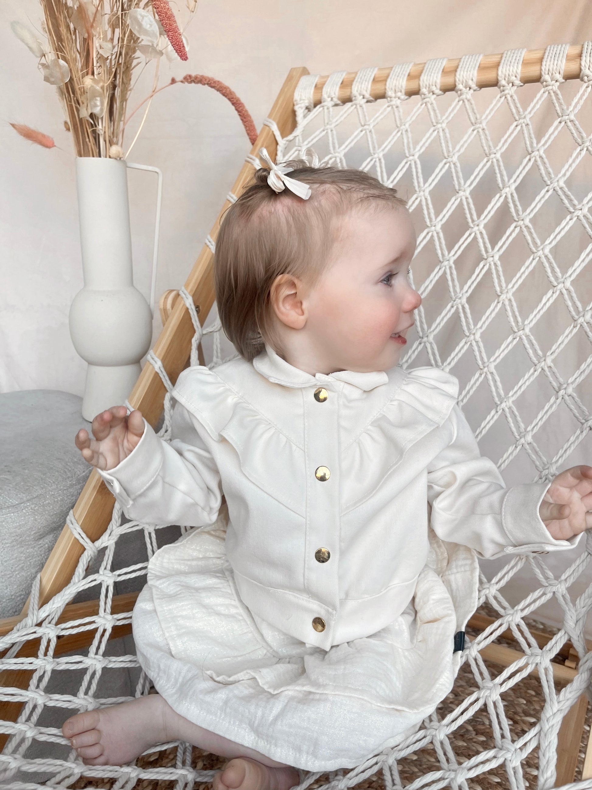 Praktisch en Eenvoudig in Gebruik: Dankzij de handige knopen is de Liya Spijkerjas Ruffle makkelijk aan en uit te trekken, wat het ideaal maakt voor ouders die op zoek zijn naar een snel en praktisch jasje voor hun kleintje.